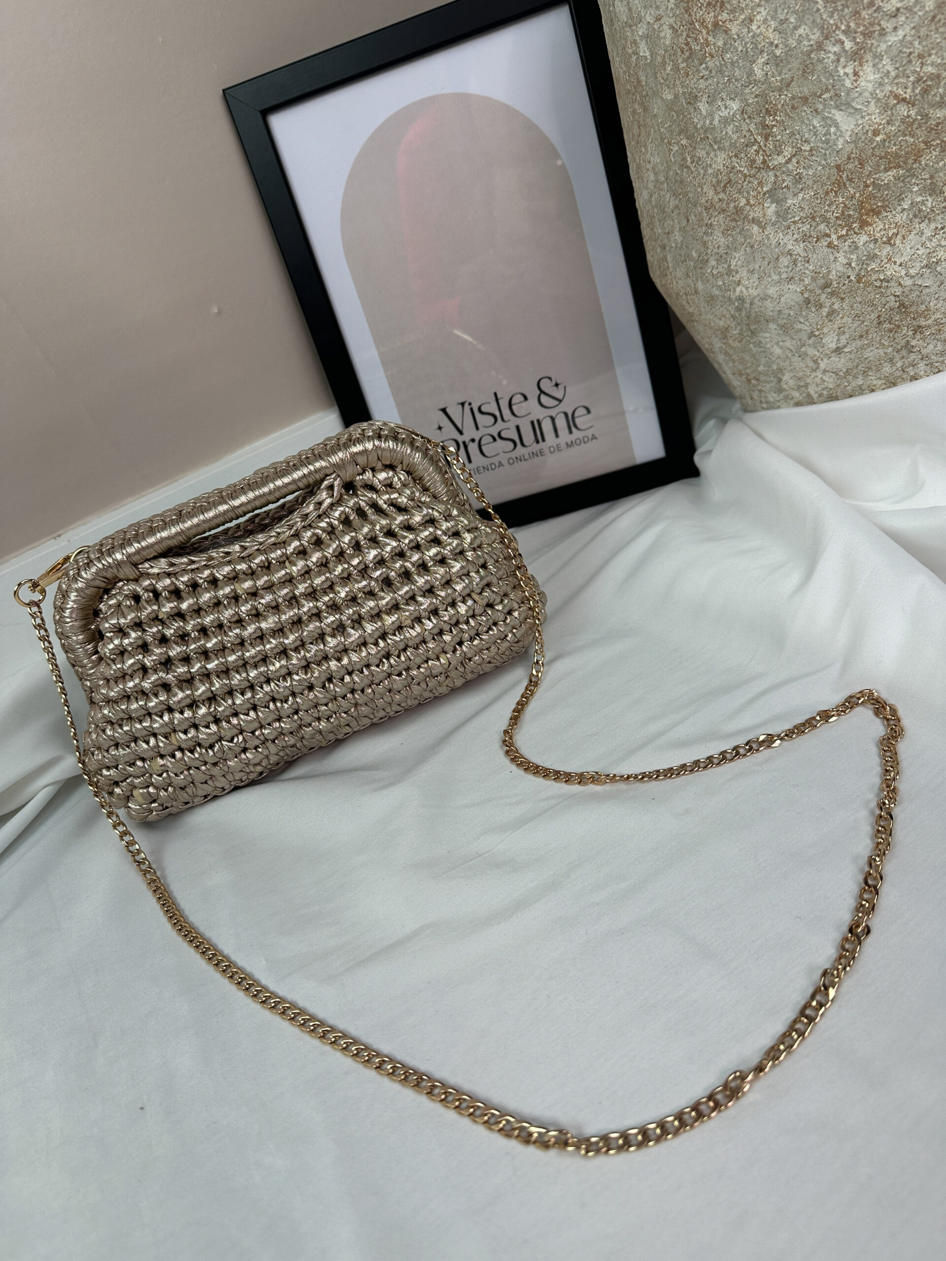 Bolso de crochet en color champán, elegante y muy combinable. Incluye cuerda dorada para colgar que le aporta un toque especial. Medidas 31 x 19 cm, práctico y perfecto para completar cualquier look.