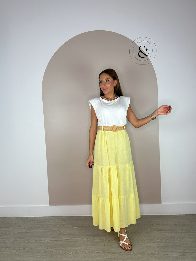 Camiseta blanca básica con hombreras, ideal para combinar con cualquier look. Talla única valorada en S, M y L. Fresca, cómoda y versátil, un imprescindible en tu armario.