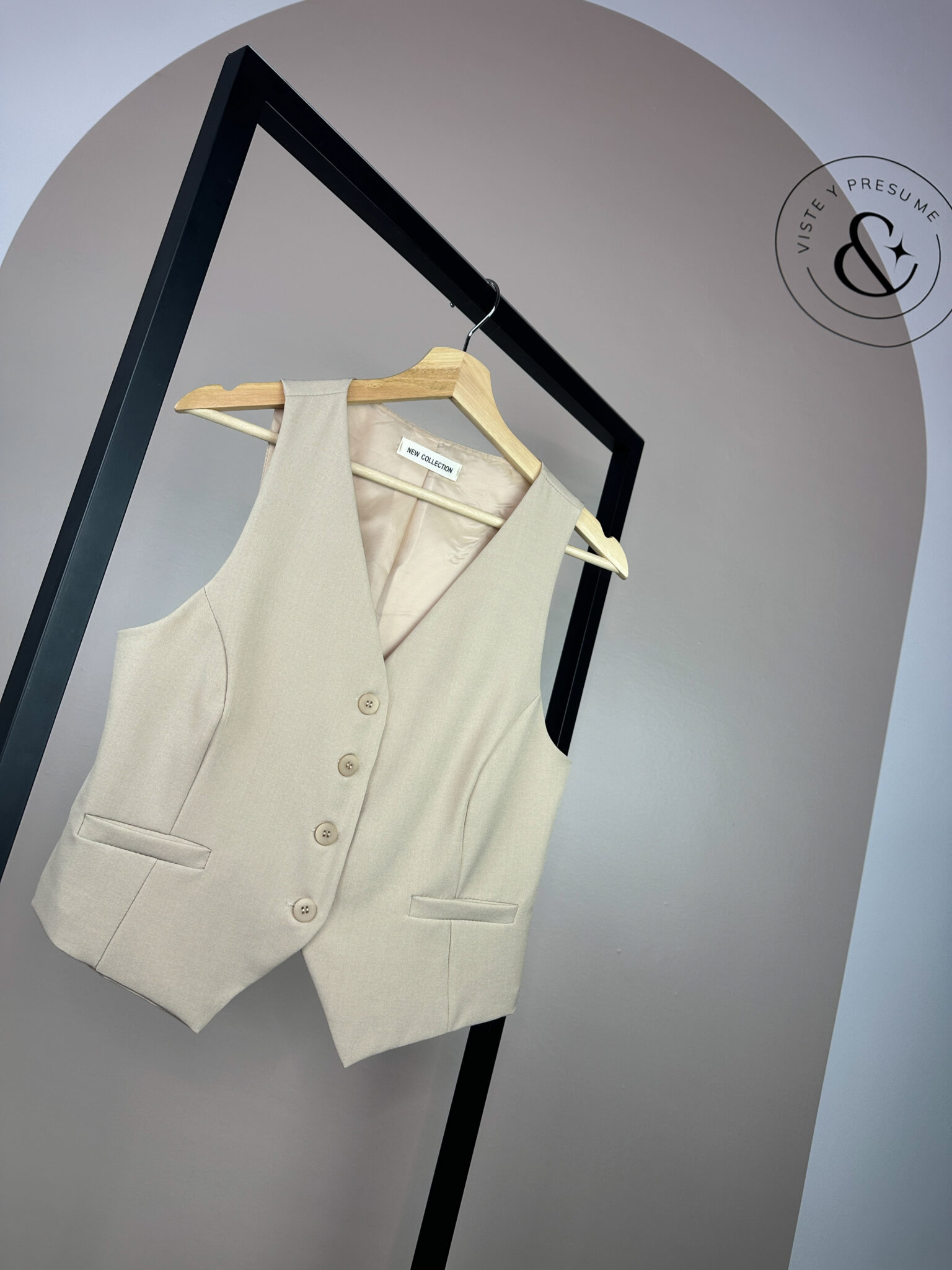 Chaleco sastre en color beige, con botones centrales que realzan su estilo clásico. Una prenda cómoda y elegante, ideal para combinar en looks formales o casuales con un toque sofisticado.