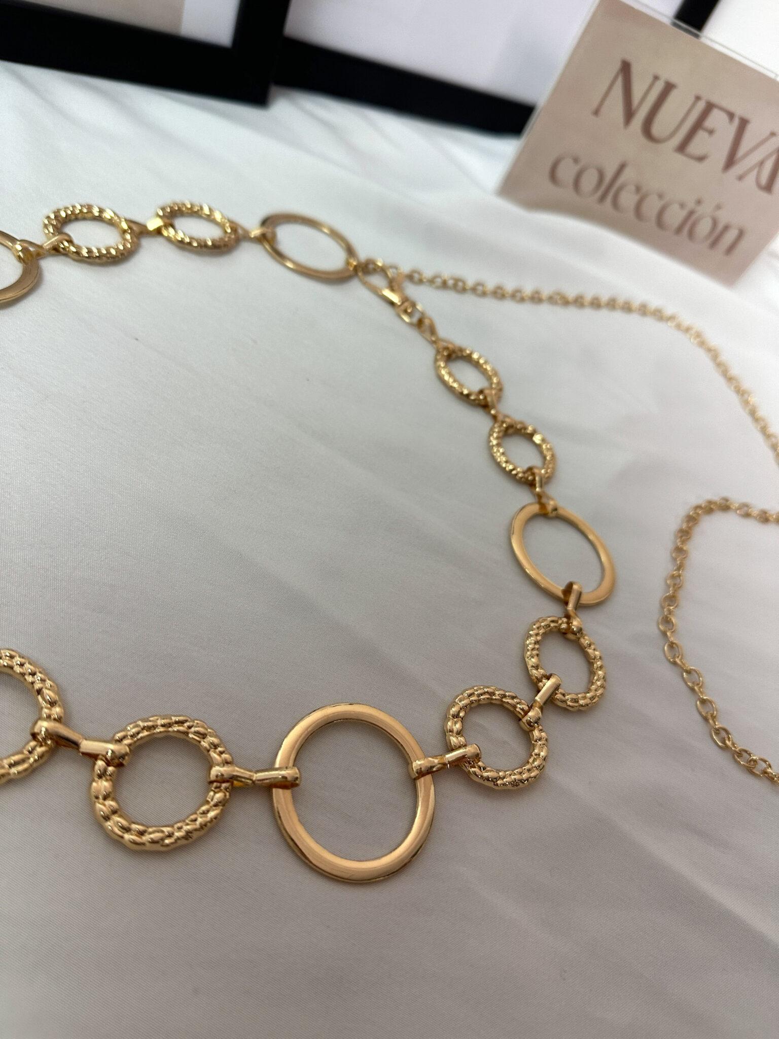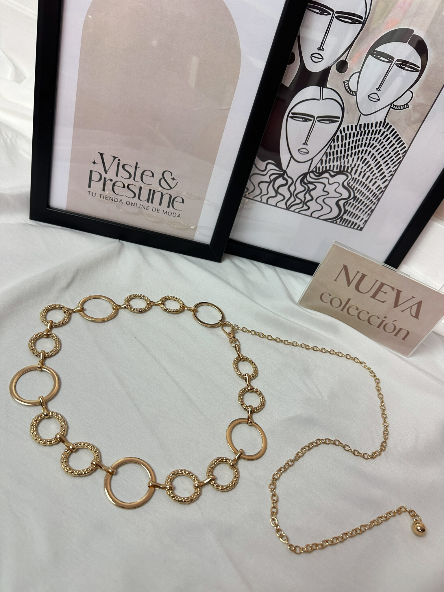 Cinturón metálico de cadena dorada con diseño de círculos entrelazados. Un accesorio elegante y versátil, ideal para dar un toque sofisticado a vestidos, faldas o pantalones.