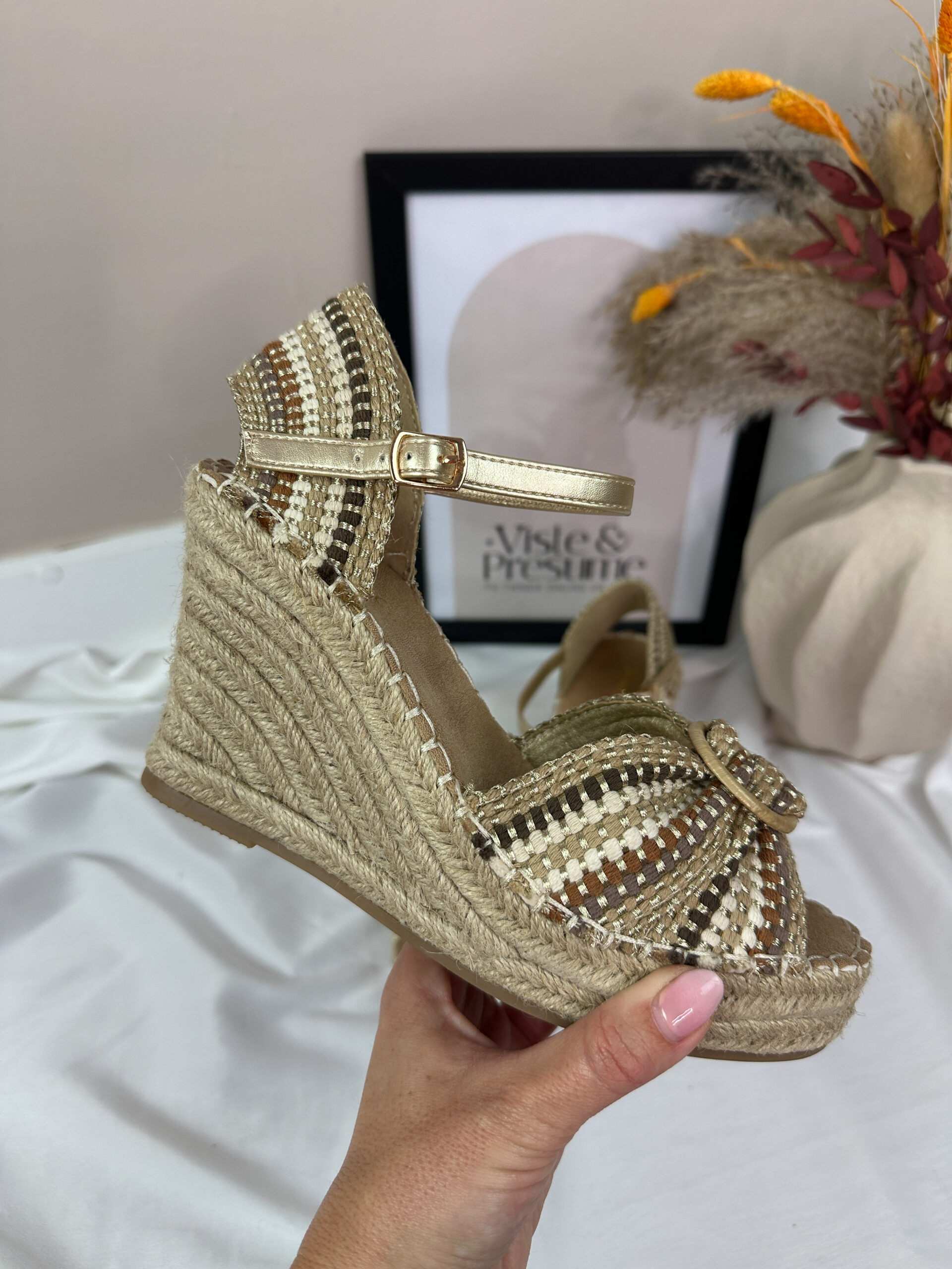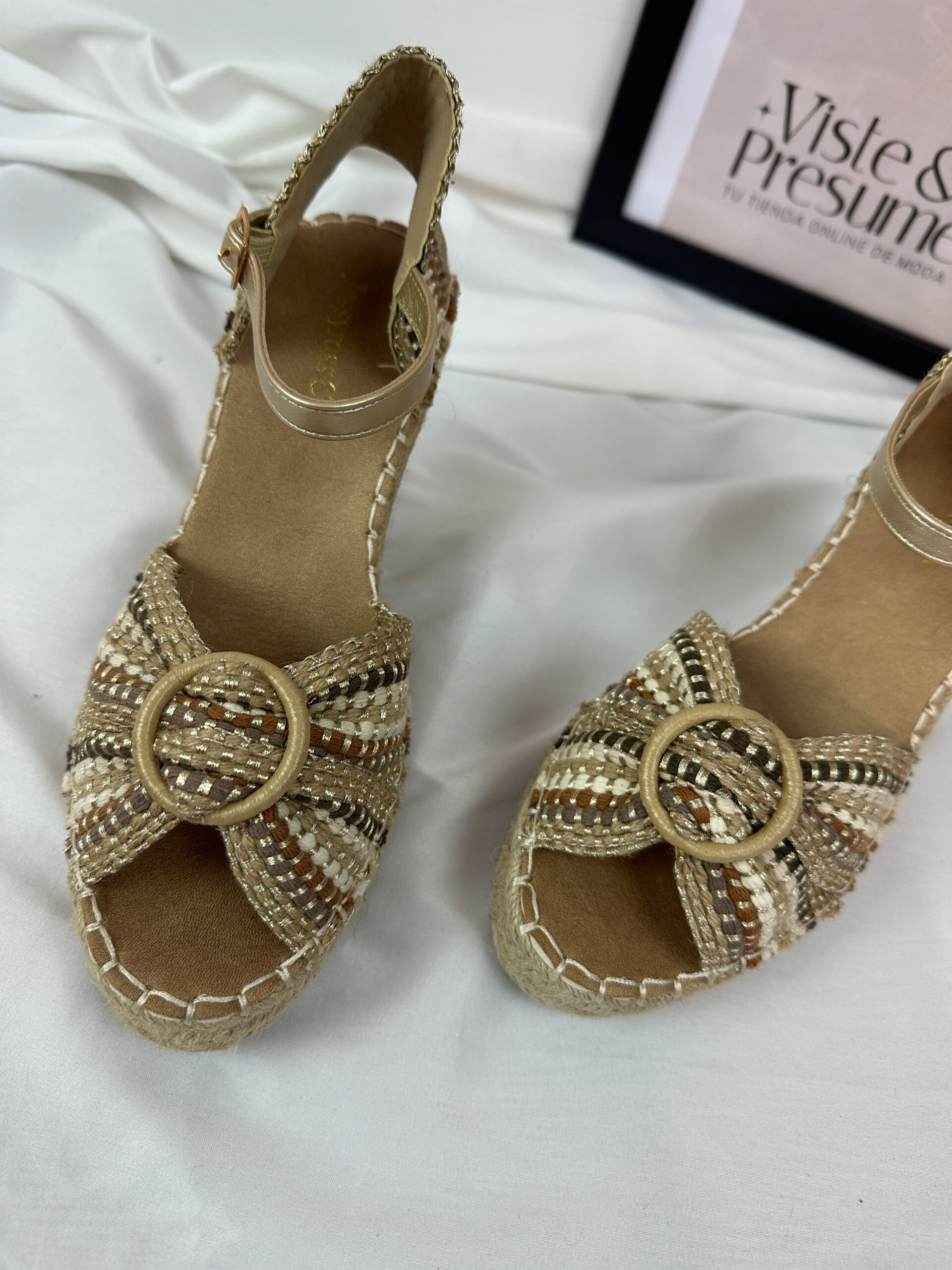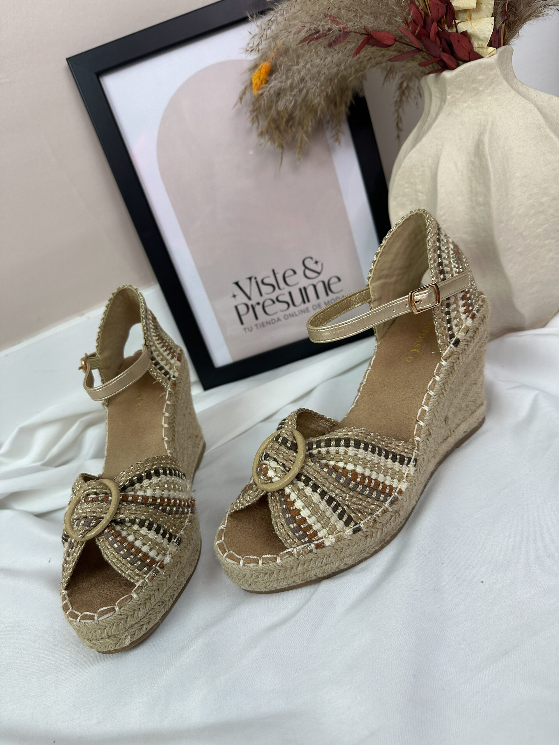 Añade un toque safari a tu verano con nuestras cuñas de rafia. Con una combinación de tonos crudo, rafia, taupe, verde y un delicado detalle dorado, estas cuñas se amarran al tobillo para un ajuste seguro y cómodo. La altura total es de 9,7 cm y el frente mide 3 cm, ofreciendo estilo y confort en cada paso. Perfectas para combinar con cualquier outfit veraniego.