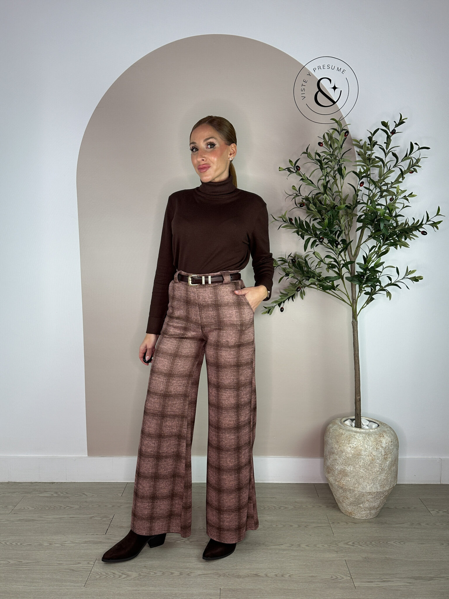 Pantalón de paño con estampado escocés de cuadros en tonos rosa palo y marrón. De tiro recto/acampanado. Incluye cinturón de lazo negro que aporta un toque elegante. Talla única, valorada para XS, S, M y L pequeña. Cómodo y perfecto para looks de temporada.