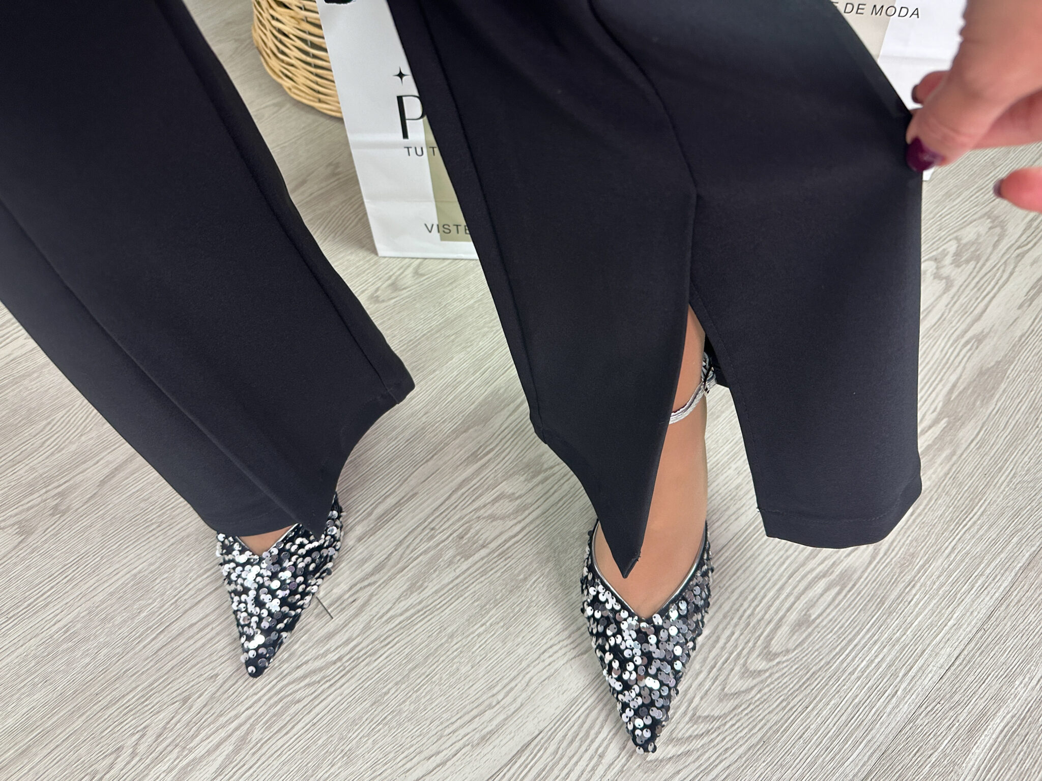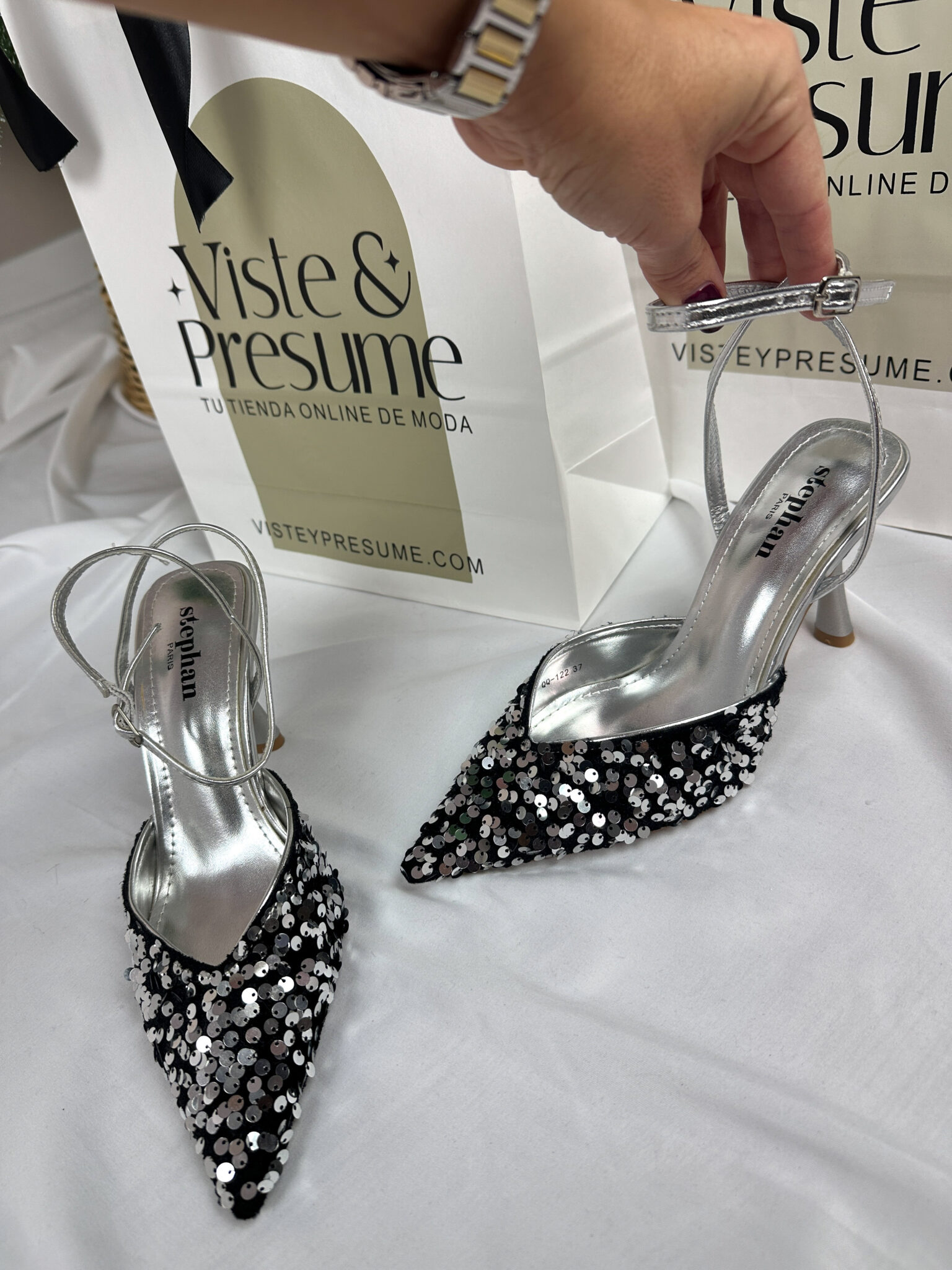 Stiletto de antelina negra decorado con lentejuelas plateadas. Con amarre al tobillo que aporta sujeción y un toque elegante. Tacón de 10 cm que estiliza la figura sin perder comodidad. El zapato perfecto para eventos, fiestas y looks que buscan destacar.