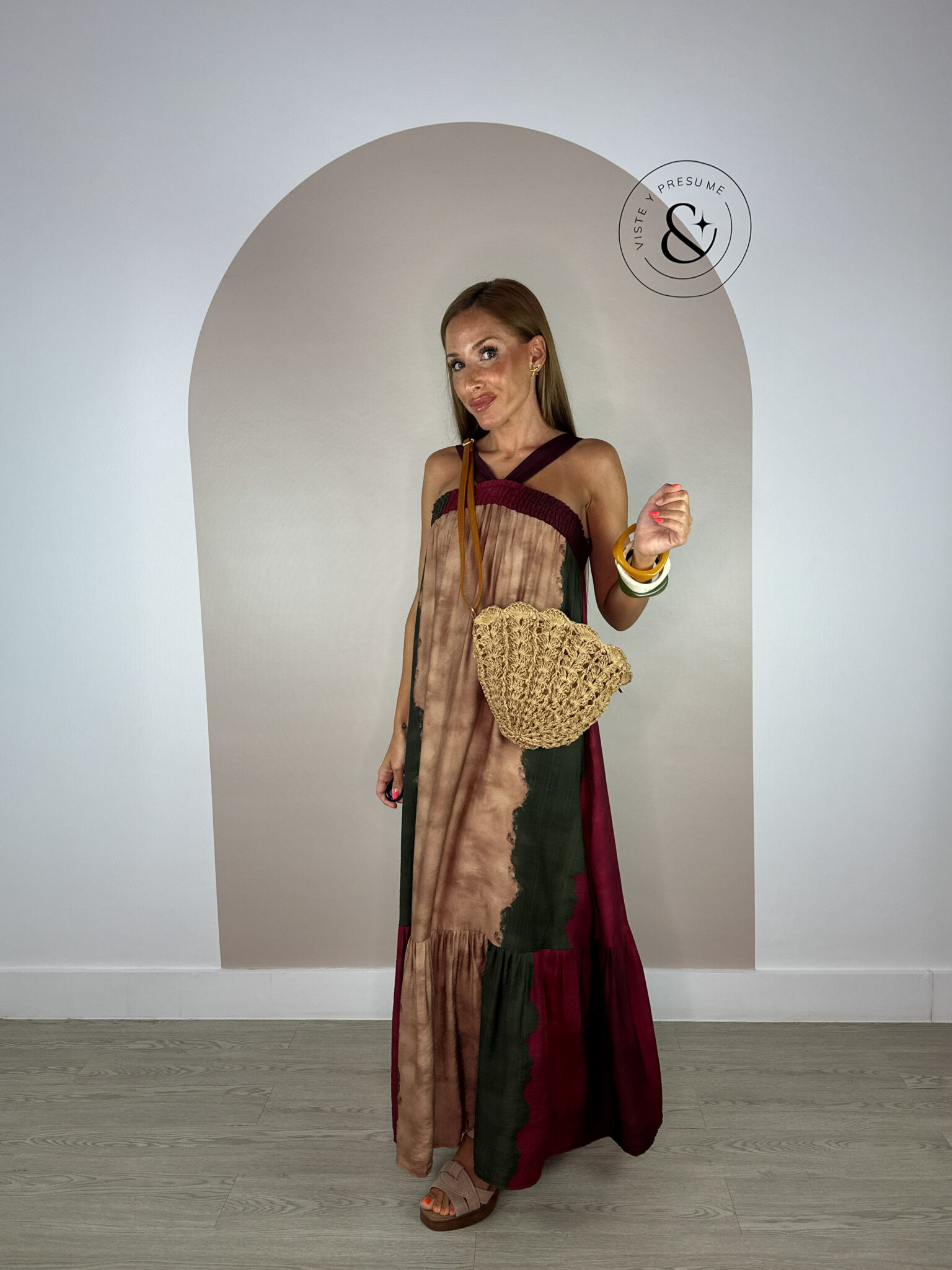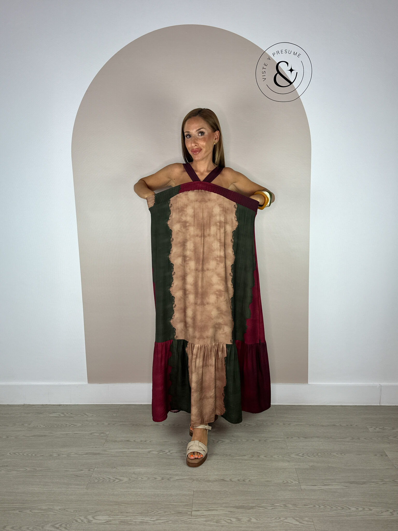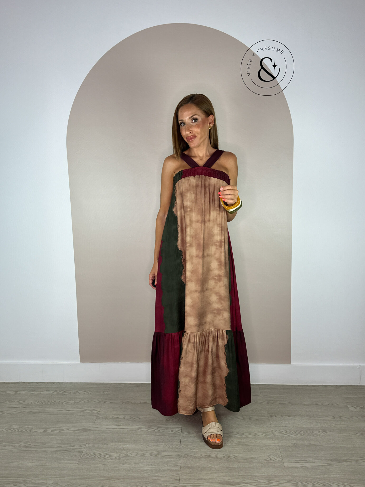 Vestido tricolor en tonos burdeos, marrón y verde militar. Largo, de tirantes y con fruncido en el pecho que se adapta cómodamente a varias tallas. Fresco, ligero y muy cómodo. Talla única, valorada para S, M, L y XL. Perfecto para los días cálidos con un toque de color.