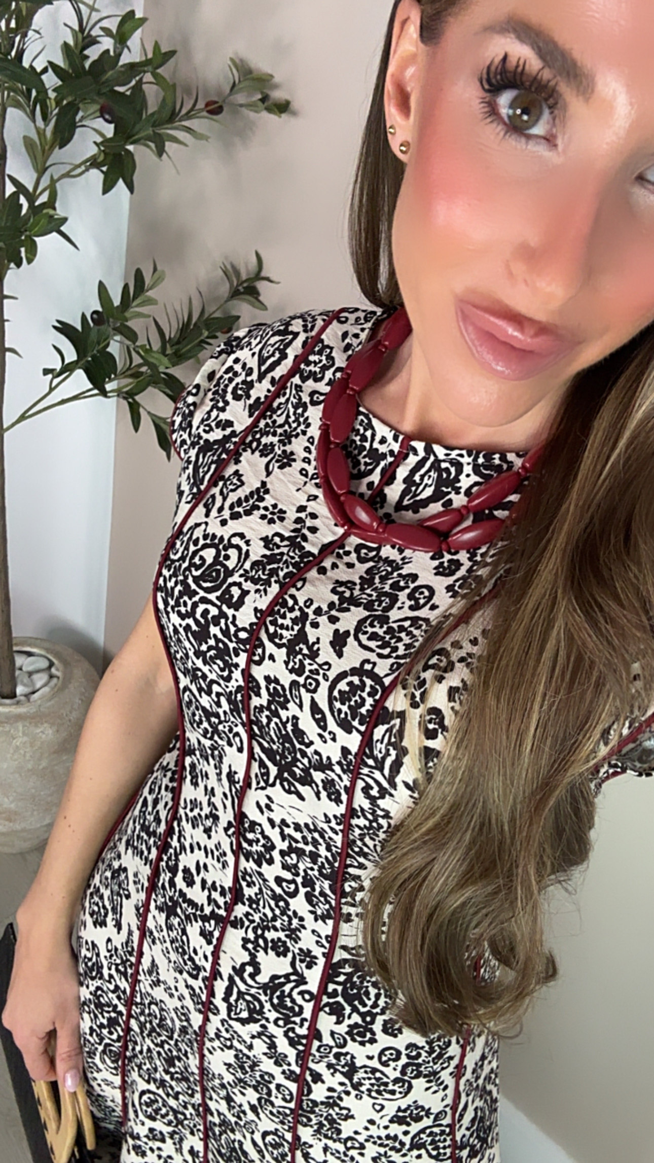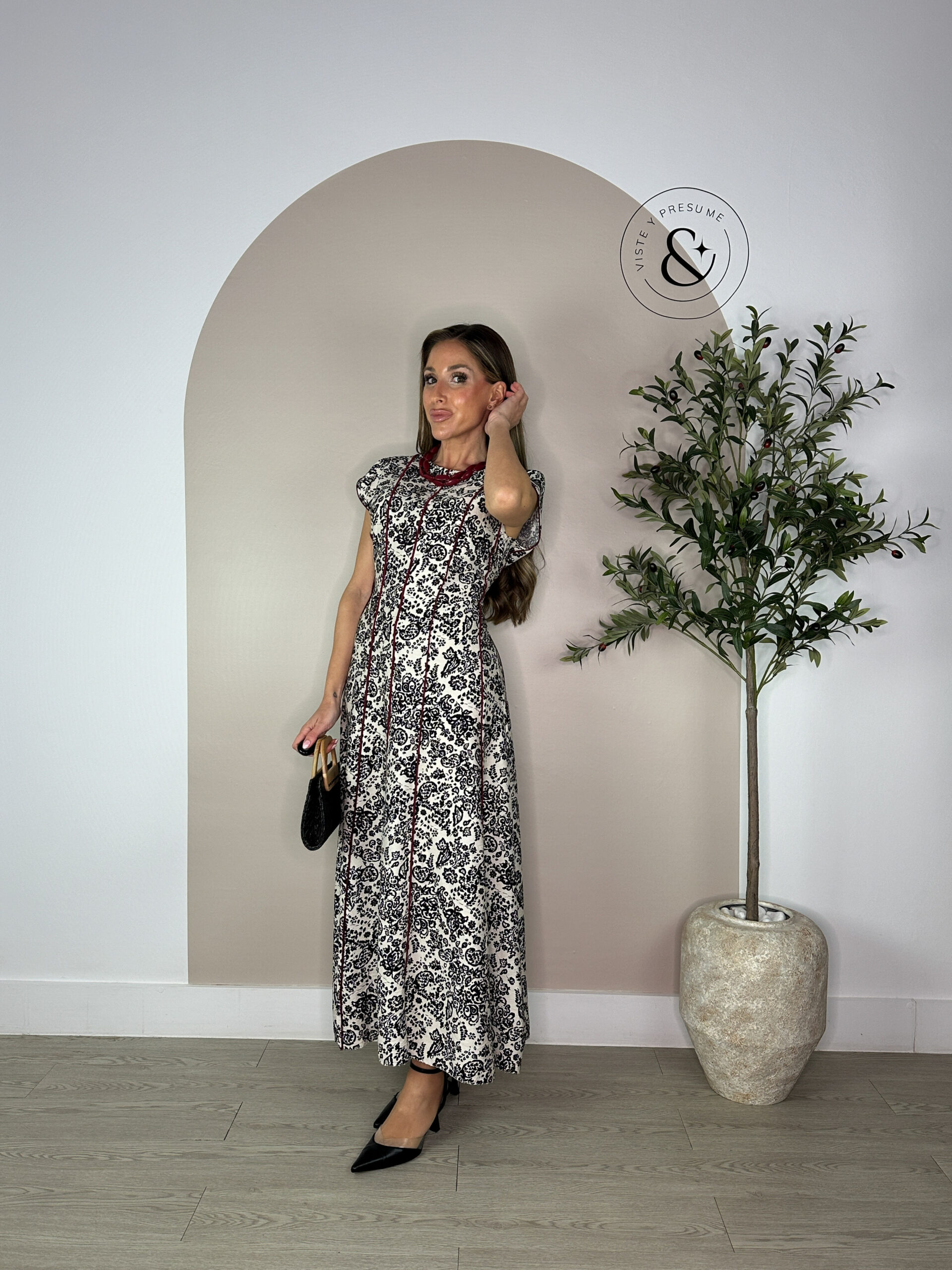 estido versátil largo de manga corta, muy cómodo y ligero. En tonos negro y blanco con algunas rayas burdeos que le dan un toque especial. Lleva fruncido en la espalda para mayor elasticidad y mejor ajuste. Talla única, valorada para M, L y XL (se recomienda probar o tomar medidas). La modelo mide 1,57 cm. Perfecto para cualquier evento con estilo.